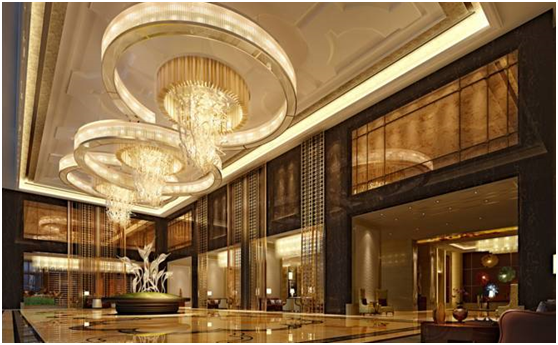 (2)The reception hall has high illuminance requirements to show the nobility of the guests. At the same time, registration and other reading and writing activities are required in the hall, and the illuminance value is not less than 300Lx. For hotels above four stars, it is recommended to add dimming equipment. There is little difference in the color temperature between the indoor and outdoor light, and the whole hotel reflects the feeling of brightness and light effect, so that people can feel the light when they enter the hotel lobby. It feels more comfortable. At the same time, the color temperature of the hotel is higher, which can also expand the visual sense of space for customers, improve the temperament of the entrance of the hotel guests, and also leave a very deep impression on the guests;